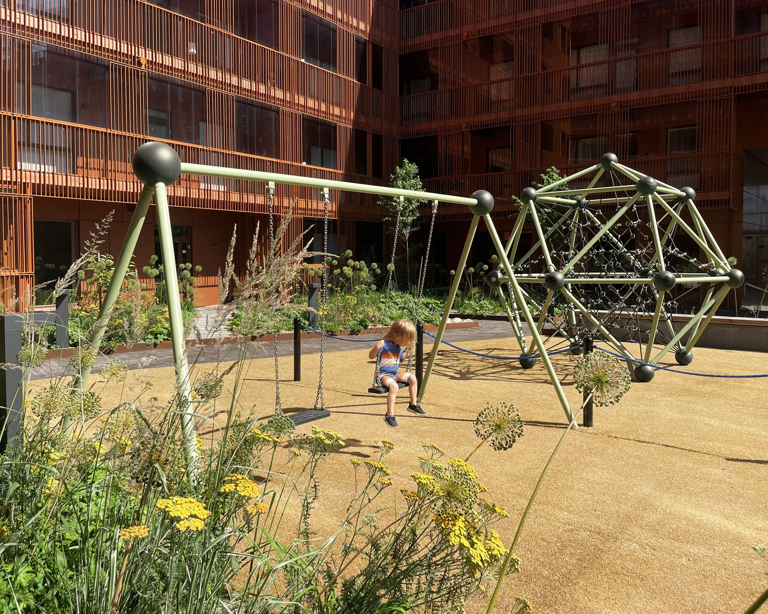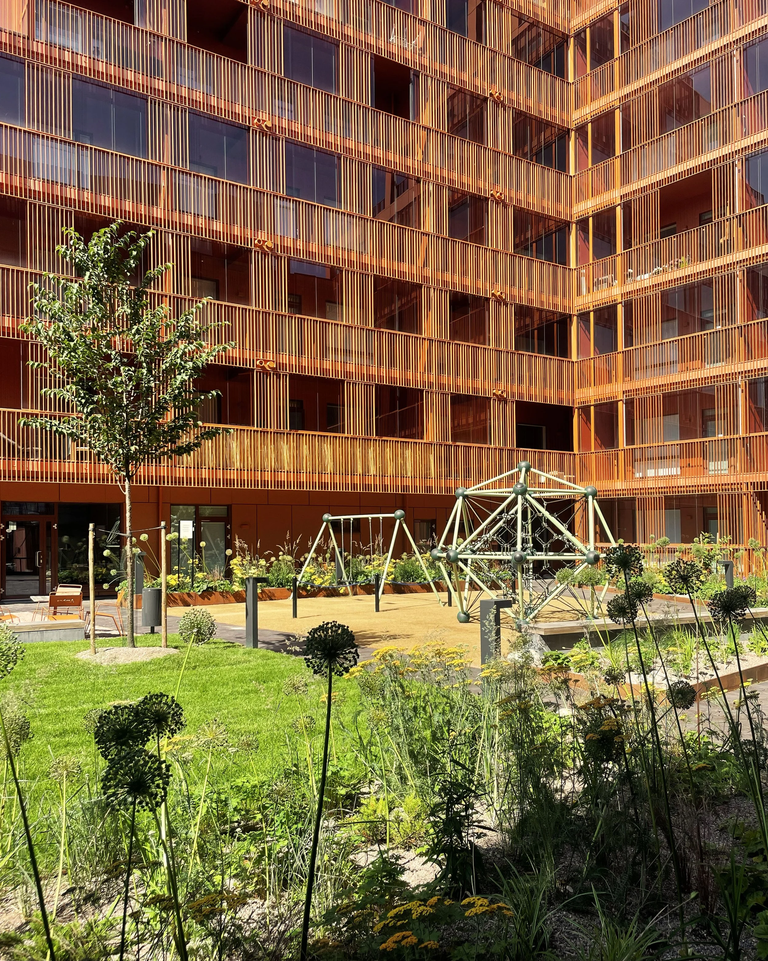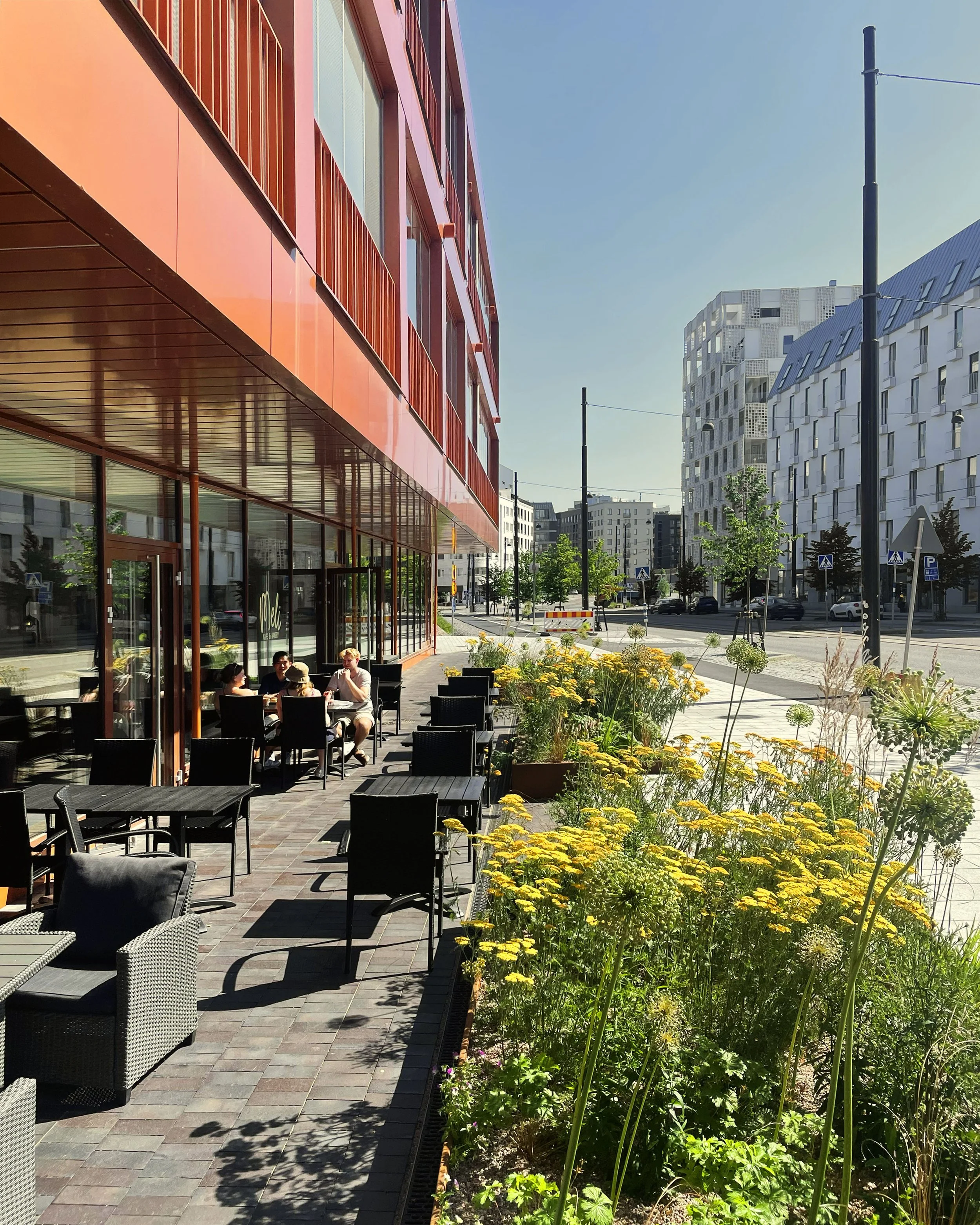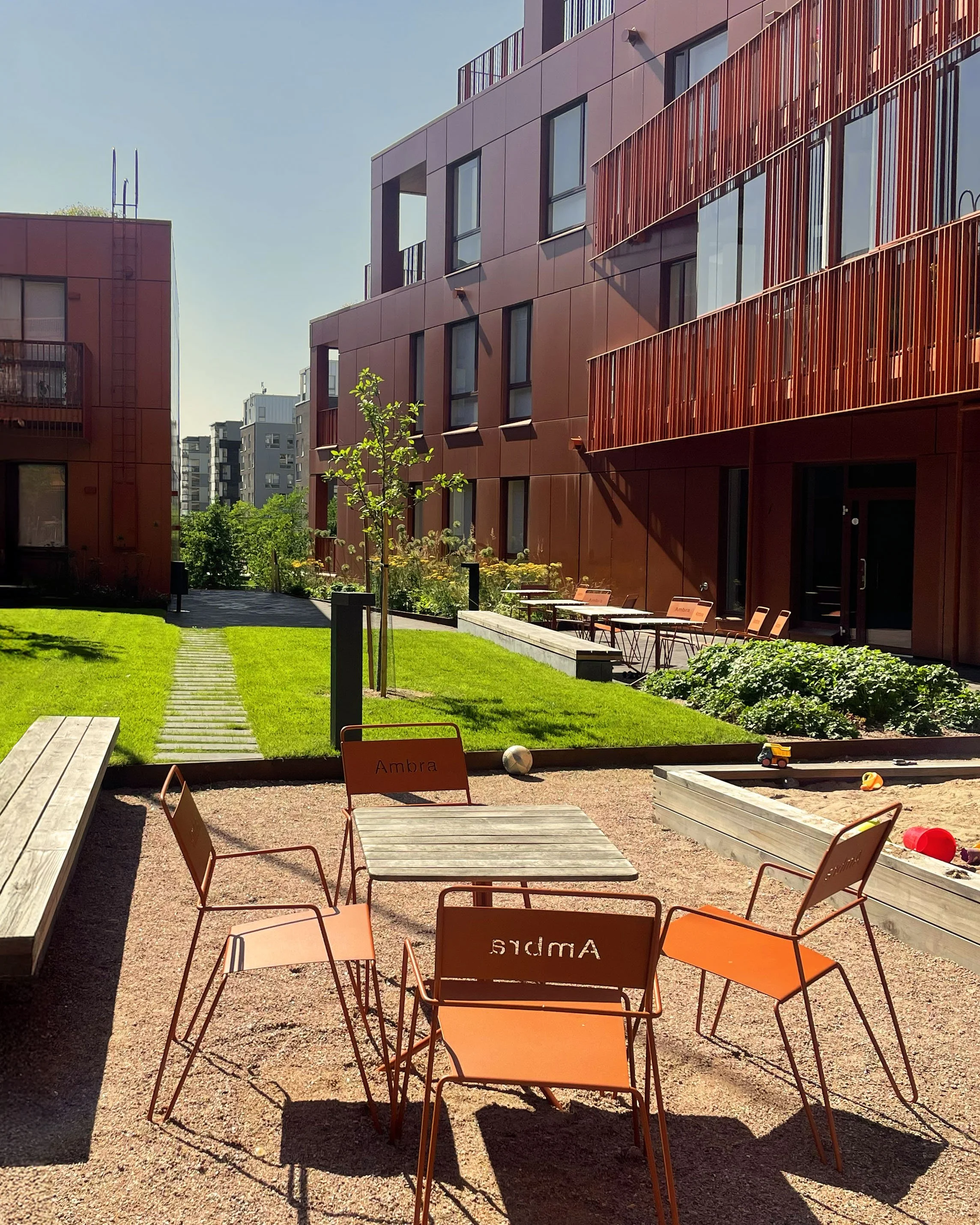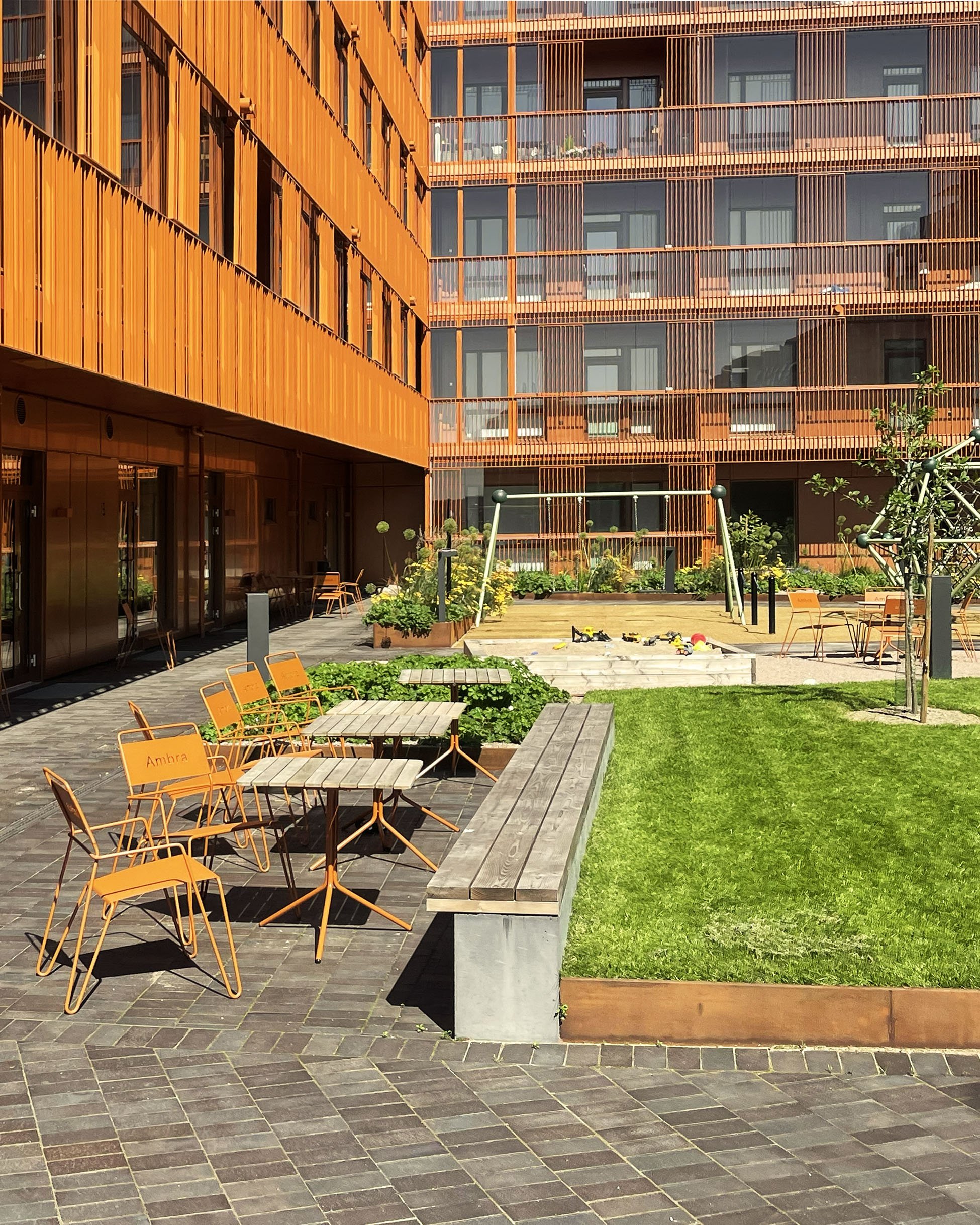 Kadunvarren terassit rajattiin monilajisilla istutuksilla vilkkaasta katualueesta. Näin luotiin kadun varteen vehreä ja rauhallinen miniaukio. Kaikki asunnot avautuvat kadulle, joten pelastusreittejä ja nostopaikkoja ei tarvinnut rakentaa sisäpihalla. Se mahdollisti kodikkaan kapeat maatiilipolut ja laajat yhtenäiset istutetut cor-ten teräksellä rajatut istutusalueet vehreälle sisäpihalle. Oleskelualueilla on taloyhtiön nimellä varustettuja liikuteltavien tuolin ryhmiä. Kattoterassien viereen istutettiin moniljaista ketokattoa.