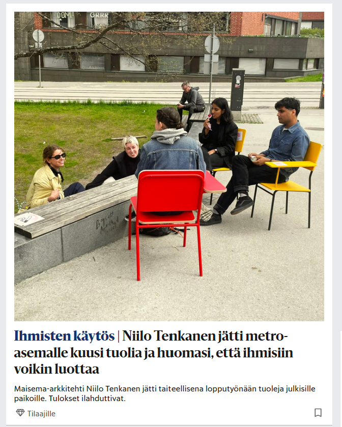 Helsingin Sanomat: Niilo Tenkanen teki ”mahdollisimman varastettavia” tuoleja ja jätti ne kaupungille: lopputulos ilahdutti